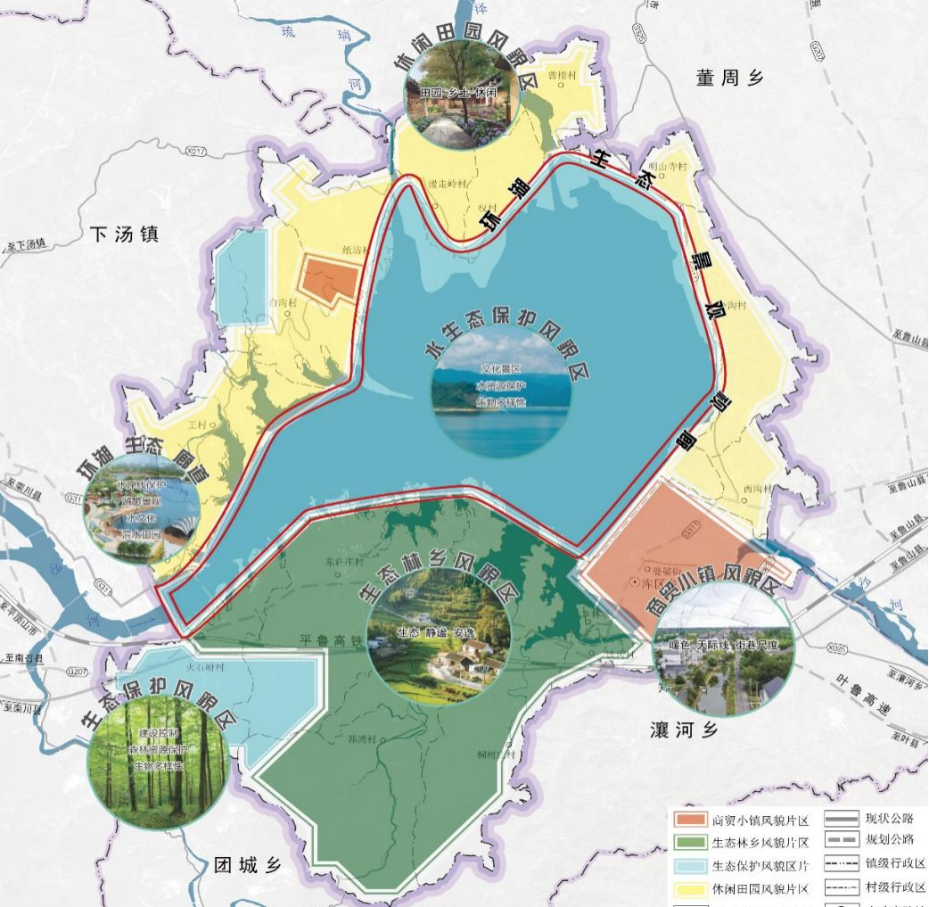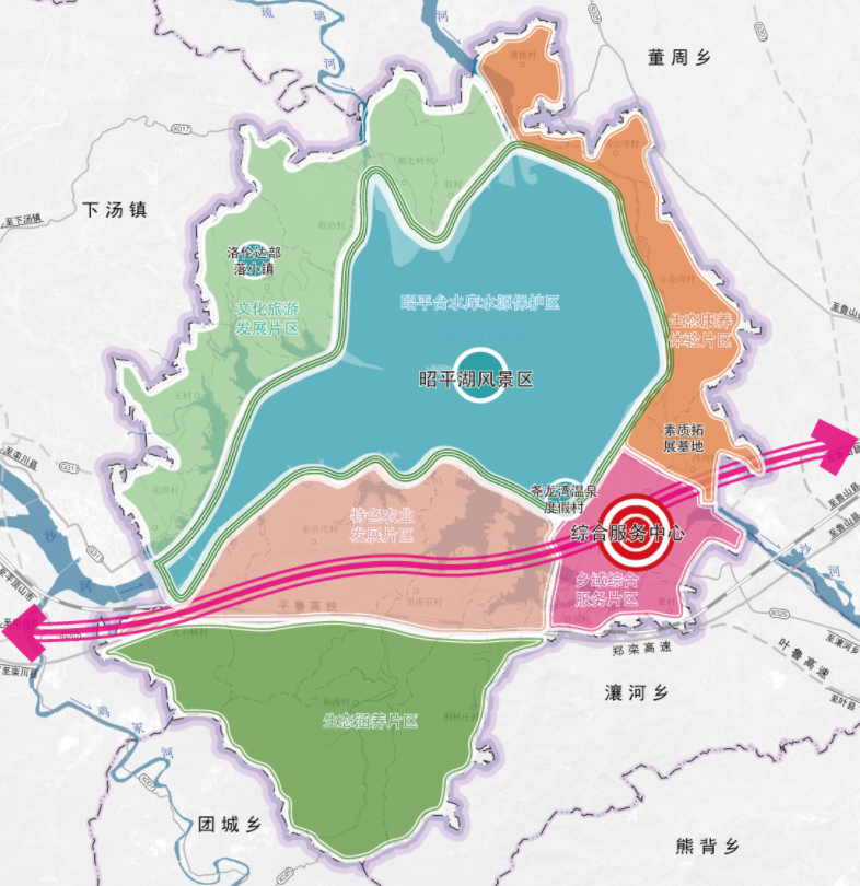 構(gòu)建了“一心、兩帶、六區(qū)”的空間格局。“一心”為鄉(xiāng)鎮(zhèn)綜合服務(wù)中心,集中布局行政辦公、商業(yè)服務(wù)、文化娛樂(lè)等設(shè)施;“兩帶”分別為沿國(guó)道城鄉(xiāng)發(fā)展帶、環(huán)昭平臺(tái)水庫(kù)濱水景觀帶,串聯(lián)起主要旅游景點(diǎn)與農(nóng)業(yè)園區(qū);“六區(qū)”包括文化旅游發(fā)展片區(qū)、特色農(nóng)業(yè)發(fā)展片區(qū)、生態(tài)康養(yǎng)體驗(yàn)片區(qū)、鄉(xiāng)域綜合服務(wù)片區(qū)、生態(tài)涵養(yǎng)片區(qū)、昭平臺(tái)水庫(kù)水源保護(hù)區(qū),各功能區(qū)相互協(xié)作、有機(jī)融合。
