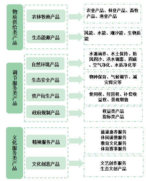 物質(zhì)供給類產(chǎn)品是指生態(tài)系統(tǒng)為人類提供的各種有形的物質(zhì)產(chǎn)品,還可分為直接利用供給生態(tài)產(chǎn)品(農(nóng)林牧漁產(chǎn)品)和轉(zhuǎn)化利用供給生態(tài)產(chǎn)品(生態(tài)能源產(chǎn)品);調(diào)節(jié)服務(wù)類產(chǎn)品是指生態(tài)系統(tǒng)通過(guò)其自身的生態(tài)過(guò)程對(duì)環(huán)境起到調(diào)節(jié)作用而產(chǎn)生的無(wú)形產(chǎn)品,包括自然生態(tài)服務(wù)產(chǎn)品、生態(tài)安全產(chǎn)品、資產(chǎn)衍生產(chǎn)品和政府規(guī)制產(chǎn)品。其中,自然生態(tài)服務(wù)產(chǎn)品主要包括水源涵養(yǎng)、水土保持、防風(fēng)固沙、海岸線防護(hù)、洪水調(diào)蓄、固碳、空氣凈化、水質(zhì)凈化等;生態(tài)安全產(chǎn)品包括物種保育、氣候調(diào)節(jié)、減災(zāi)降災(zāi)等;資產(chǎn)衍生產(chǎn)品是由生態(tài)資源要素所有權(quán)衍生出的、具有明確產(chǎn)權(quán)的生態(tài)產(chǎn)品,政府規(guī)制產(chǎn)品是通過(guò)政府管控手段創(chuàng)造特定交易需求而形成的權(quán)益或指標(biāo)類生態(tài)產(chǎn)品,其中權(quán)益類產(chǎn)品主要包括碳排放配額、碳普惠、碳匯產(chǎn)品、排污權(quán)、用能權(quán)、取水權(quán)等,指標(biāo)類產(chǎn)品包括綠化增量責(zé)任指標(biāo)、森林覆蓋率考核指標(biāo)、森林單位蓄積增量指標(biāo)、清水增量責(zé)任指標(biāo)、海岸線占補(bǔ)平衡指標(biāo)、生態(tài)積分、水質(zhì)信用、地票等。文化服務(wù)類產(chǎn)品指生態(tài)系統(tǒng)為人類提供的具有文化、精神和娛樂(lè)價(jià)值的產(chǎn)品和服務(wù),主要包括精神服務(wù)產(chǎn)品和文化創(chuàng)意產(chǎn)品,其中,精神服務(wù)產(chǎn)品包括旅游康養(yǎng)、休閑游憩、教育文化、體育賽事等,文化創(chuàng)意產(chǎn)品包括文藝創(chuàng)作服務(wù)和生態(tài)文創(chuàng)產(chǎn)品等。