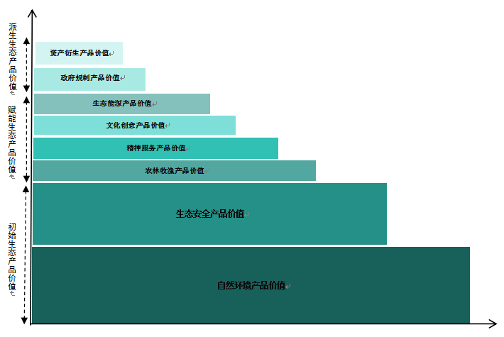 通過(guò)分析,本文認(rèn)為生態(tài)產(chǎn)品價(jià)值可以理解為初始生態(tài)產(chǎn)品價(jià)值、賦能生態(tài)產(chǎn)品價(jià)值、派生生態(tài)產(chǎn)品價(jià)值,且生態(tài)產(chǎn)品價(jià)值的構(gòu)成比例呈現(xiàn)階梯型分布特征(圖3)。初始生態(tài)產(chǎn)品價(jià)值是指生態(tài)系統(tǒng)最基礎(chǔ)、最核心的價(jià)值,是其他所有價(jià)值衍生的源頭,主要包括生態(tài)安全產(chǎn)品價(jià)值、自然環(huán)境產(chǎn)品價(jià)值;賦能生態(tài)產(chǎn)品價(jià)值是指在初始生態(tài)產(chǎn)品價(jià)值基礎(chǔ)上,通過(guò)適度的人工勞動(dòng)、技術(shù)投入、管理優(yōu)化或品牌建設(shè)等手段,對(duì)初始生態(tài)產(chǎn)品進(jìn)行品質(zhì)提升、功能拓展、效率提高,將其轉(zhuǎn)化為可直接滿足人類物質(zhì)和精神需求的、更具市場(chǎng)交易屬性的產(chǎn)品或服務(wù),主要包括農(nóng)林牧漁產(chǎn)品價(jià)值、精神服務(wù)產(chǎn)品價(jià)值、文化創(chuàng)意產(chǎn)品價(jià)值、生態(tài)能源產(chǎn)品價(jià)值等;派生生態(tài)產(chǎn)品價(jià)值是指在初始產(chǎn)品和賦能產(chǎn)品價(jià)值的基礎(chǔ)上,通過(guò)制度設(shè)計(jì)、金融創(chuàng)新以及市場(chǎng)機(jī)制所衍生的,代表生態(tài)價(jià)值產(chǎn)權(quán)或政策目標(biāo)的抽象化、金融化或規(guī)制性價(jià)值,主要包括資產(chǎn)衍生產(chǎn)品價(jià)值、政府規(guī)制產(chǎn)品價(jià)值等。