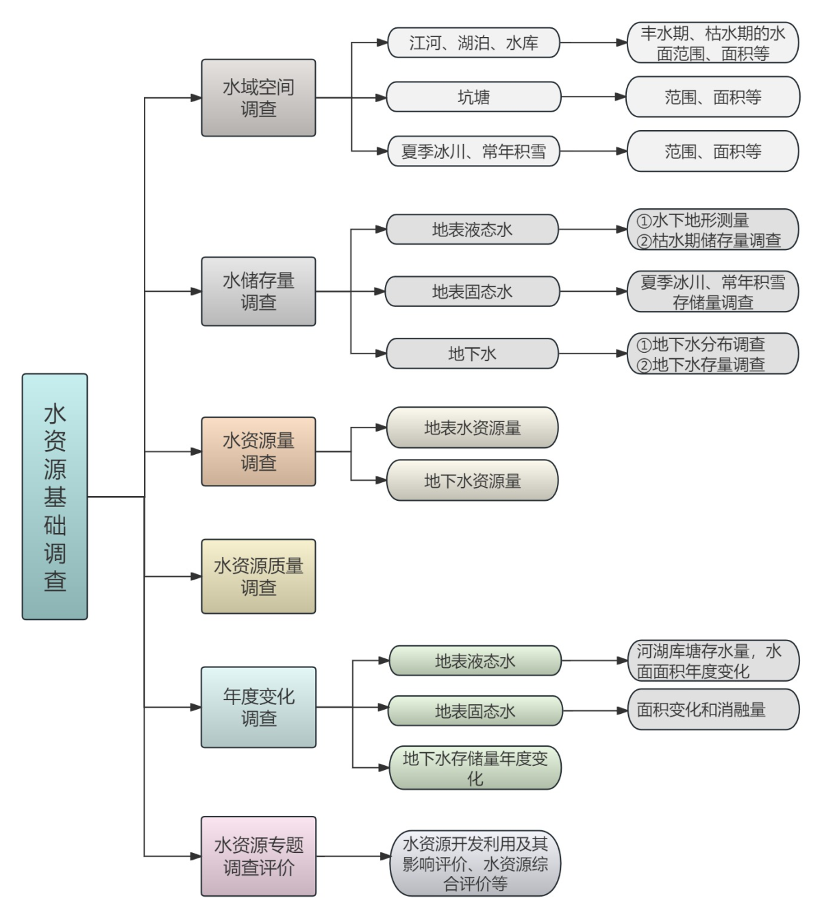 水資源基礎(chǔ)調(diào)查中專題調(diào)查內(nèi)容主要包括水資源開發(fā)利用及其影響評價(jià)、水資源綜合評價(jià)等專題調(diào)查評價(jià),如下圖所示。