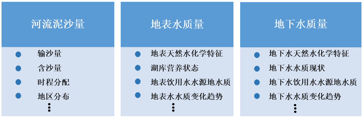 對水資源主要指標(biāo)開展年度變化調(diào)查評價(jià),包括湖泊、水庫和重點(diǎn)江河水體儲(chǔ)存年度變化量,地下水儲(chǔ)存年度變化量,冰川及常年積雪年度面積變化和消融量,河湖庫塘水面面積年度變化等,具體指標(biāo)如下圖所示。