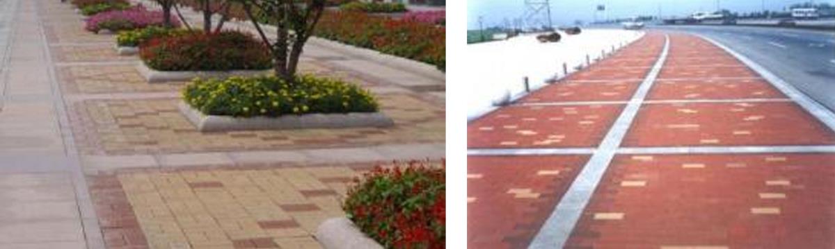 自行車道對于鋪裝平整度的要求與步行道相同,但對于圖案樣式與質感變化的要求稍低。在自行車道的重要決策點,包括起止點、轉折點和機非潛在沖突路口或路段等,可變換顏色,采用彩色鋪裝的形式,從而提示使用者注意前方路況或行駛安全。此外,采用不同顏色的彩色自行車道路面鋪裝可將機動車道與非機動車道清晰地進行分隔,既減少不必要的隔離設施、節(jié)約道路空間,又比傳統(tǒng)劃線分隔更加清楚明朗,建設費用更低。
