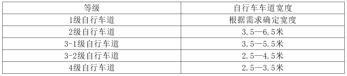 自行車網絡可以分為4級。1級自行車道路為自行車專用道路,嚴格禁止機動車通行;2級自行車道路為組團間骨干自行車道路,以聯系城市組團的自行車路組成;3、4級自行車道路為自行車單元間的自行車道,包括城市主干路、次干路和支路。